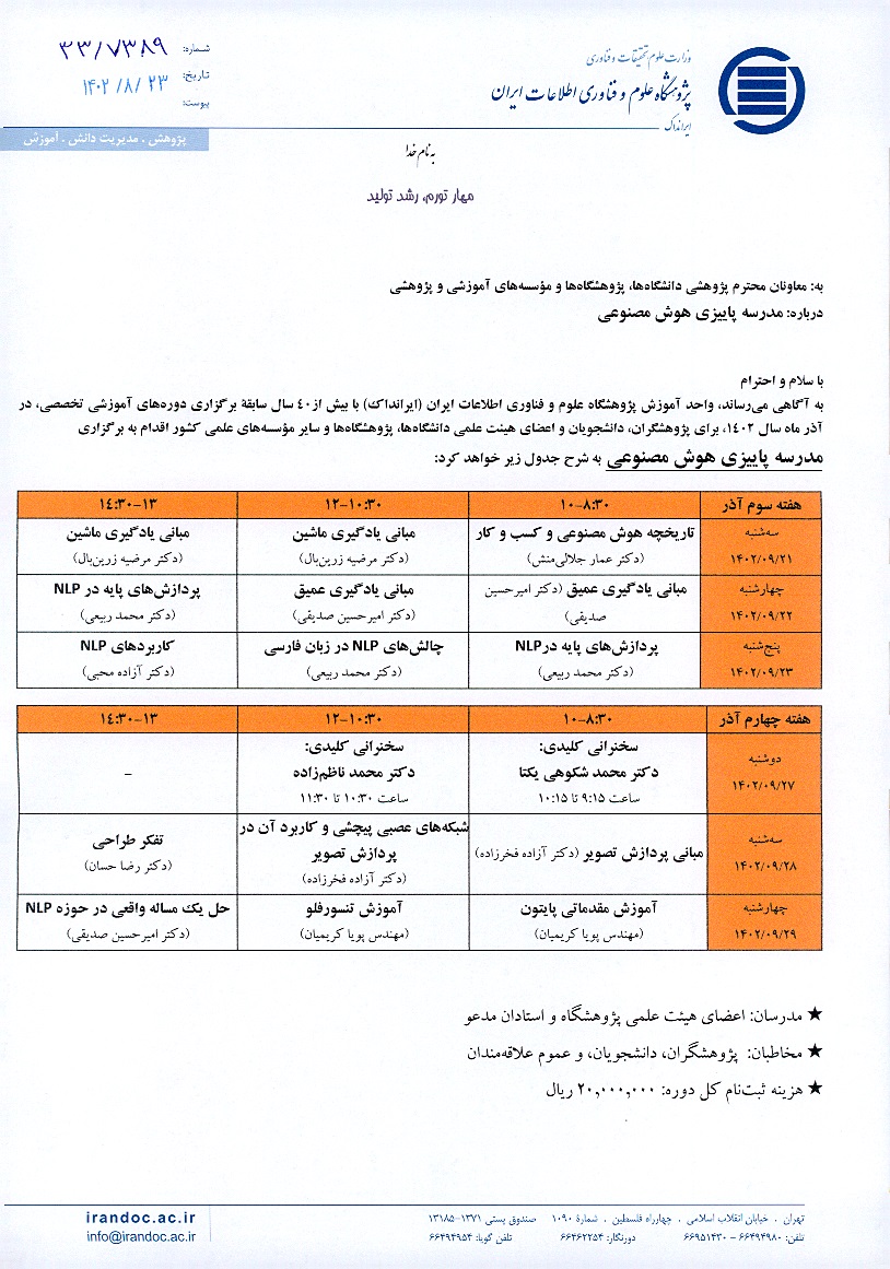 برگزاری دوره هوش مصنوعی در پژوهشگاه علوم و فناوری اطلاعات ایران ایرانداک